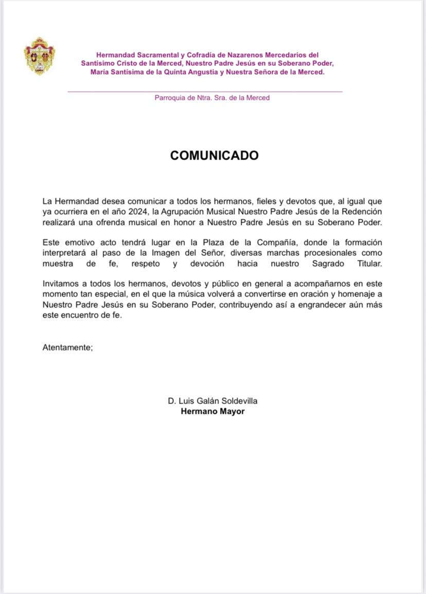 La Agrupación Musical de Nuestro Padre Jesús de la Redención, realizara una ofrenda musical a Nuestro Padre Jesús en su Soberano Poder, a su paso por la Plaza de la Compañía el próximo miércoles de pasión.